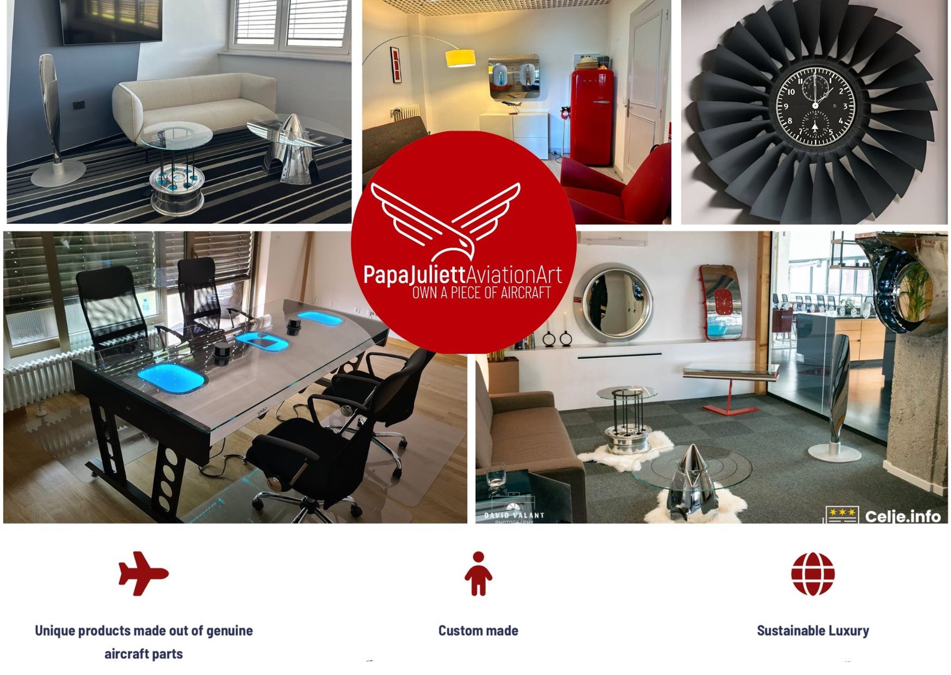 Od konferenčnih miz, izdelanih iz letalskih kril in trupa, do stenskega bara za pijače, stenskih ur narejenih iz letalskih vrat in več... naša kolekcija na novo definira kreativnost.